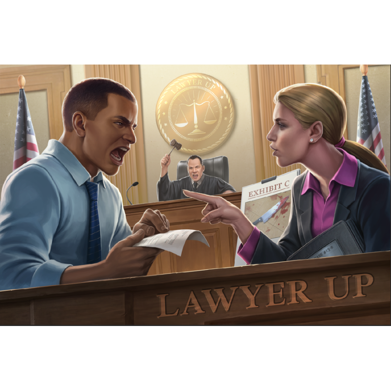 In Lawyer Up, a two-player asymmetrical card game, players take on the roles of attorneys facing off against each other in a courtroom case. One player takes on the role of the prosecution and the other takes on the role of defense. Each case has its own unique mechanisms and story from Murder to Racketeering.