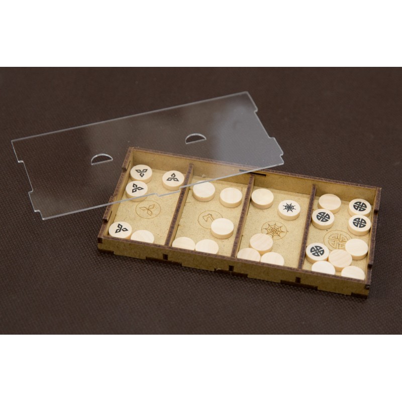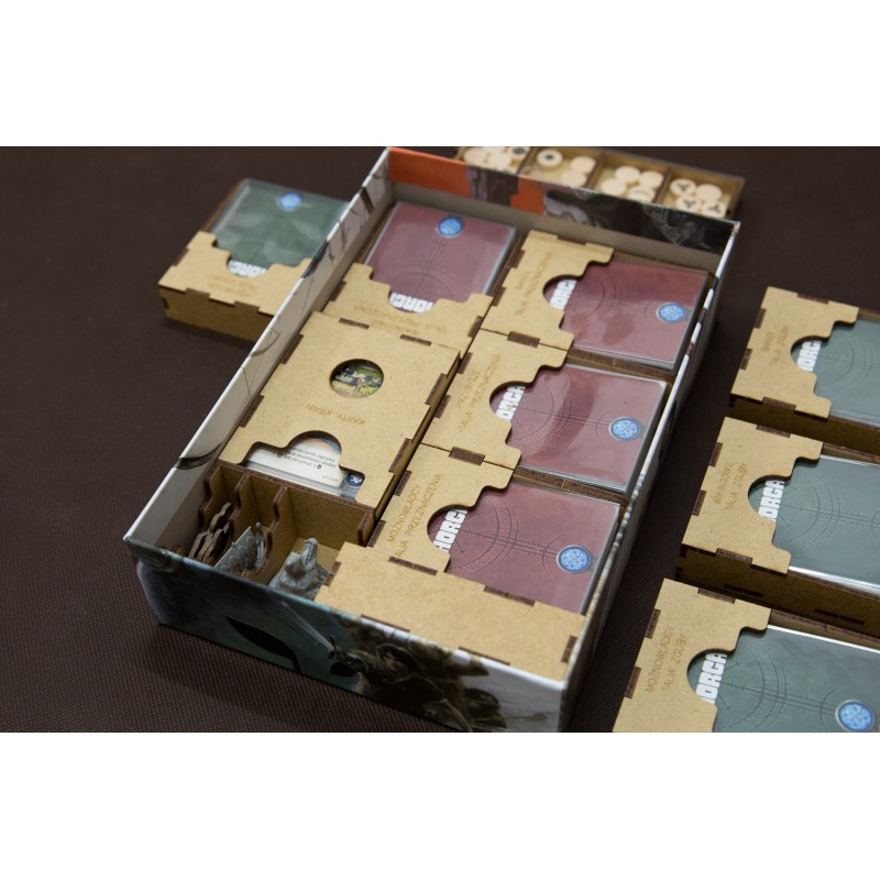 Insert zawiera 8 pojemników na karty do wyłożenia na stół, które stanowią podajniki do kart. Dodatkowy pojemnik na karty pozwala przechowywać posegregowane karty krain. Pojemnik na znaczniki stanowi tackę do wyłożenia na stół.