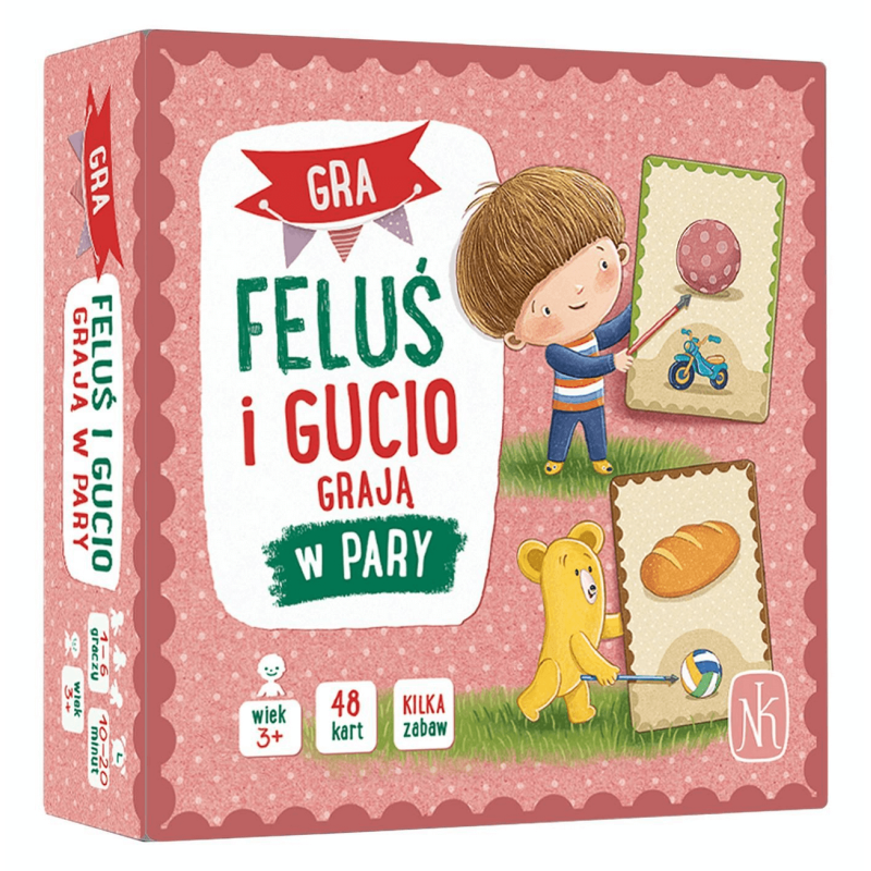 Feluś i Gucio grają w pary to aktywizująca gra edukacyjna kształtująca myślenie logiczne dzieci na różnych etapach wieku przedszkolnego. Gra wzmacnia koncentrację, uczy dostrzegania różnic i podobieństw oraz kategoryzowania przedmiotów. Dzięki tworzeniu par na różne sposoby dzieci rozwijają: spostrzegawczość, pamięć wzrokową oraz słownictwo. Doskonalenie procesów myślowych przedszkolaków to podstawa przygotowania dziecka do dalszych etapów edukacji. Zestaw doskonale się sprawdzi i w domu, i w przedszkolu.