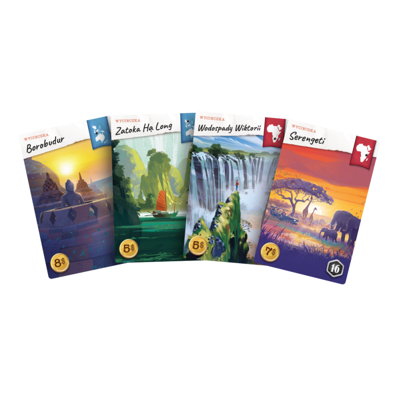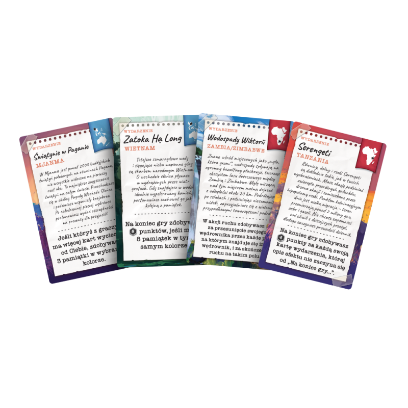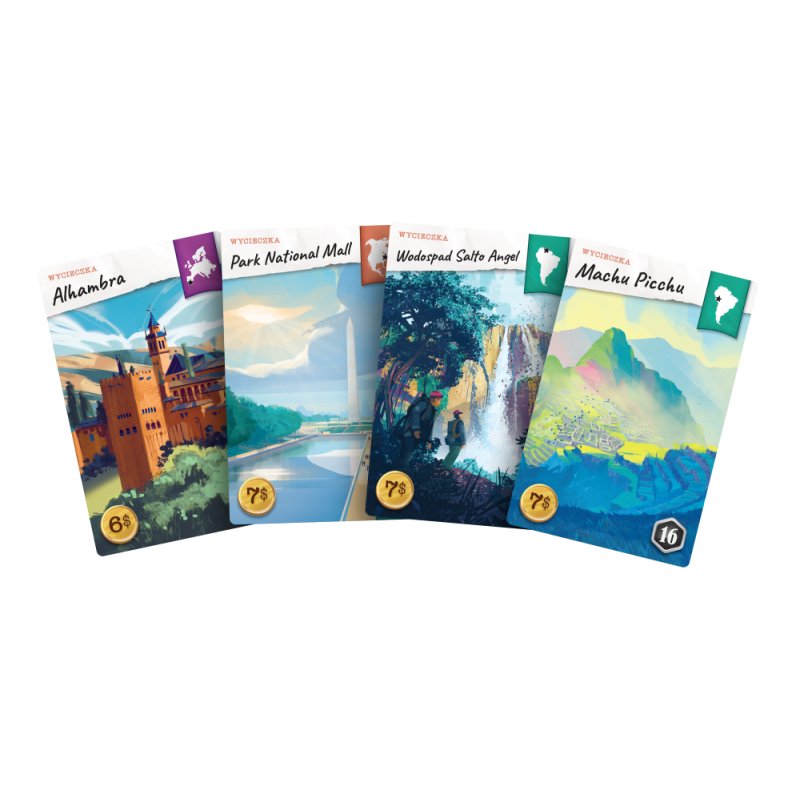 - 48 kart wycieczek/wydarzeń zabierze nas w podróż do najciekawszych miejsc z całego świata. Znajdziemy na nich przepiękne ilustracje oraz klimatyczne opisy, dzięki którym gra zyskuje edukacyjny charakter.