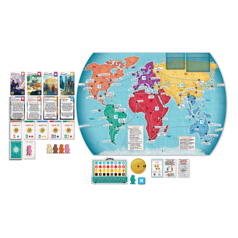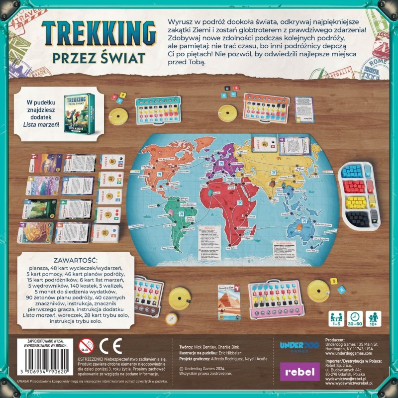 Trekking przez świat to rodzinna gra planszowa, w której wyruszamy w niesamowite podróże, by odwiedzać fantastyczne miejsca i poznawać wspaniałych ludzi z każdego zakątka globu. W każdej turze będziemy przemieszczali się po mapie, gromadząc pamiątki i biorąc udział w rozmaitych wydarzeniach, które zapewnią nam cenne punkty zwycięstwa.