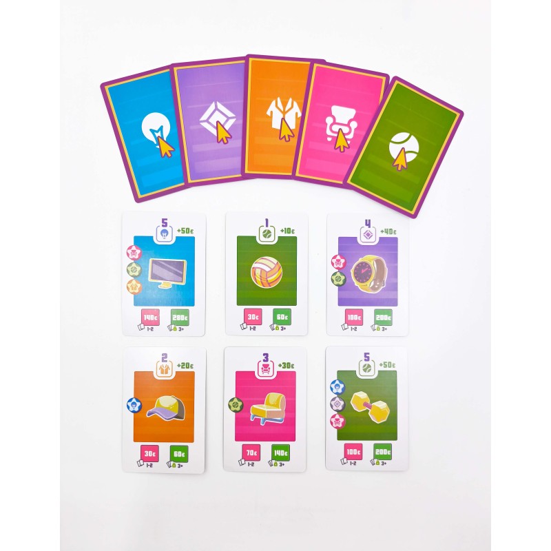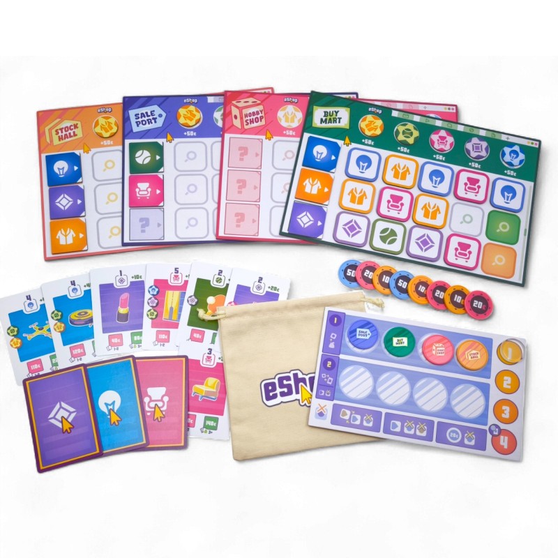 eShop is a strategic economic game where 2-4 players manage competing online stores over four rounds. Players draw item tokens from a bag to stock their shops, then fulfill customer orders by spending matching goods. The core challenge lies in balancing inventory management with order completion while adapting to changing market demands.