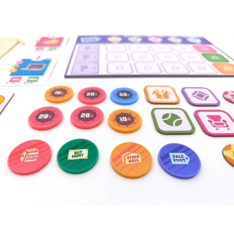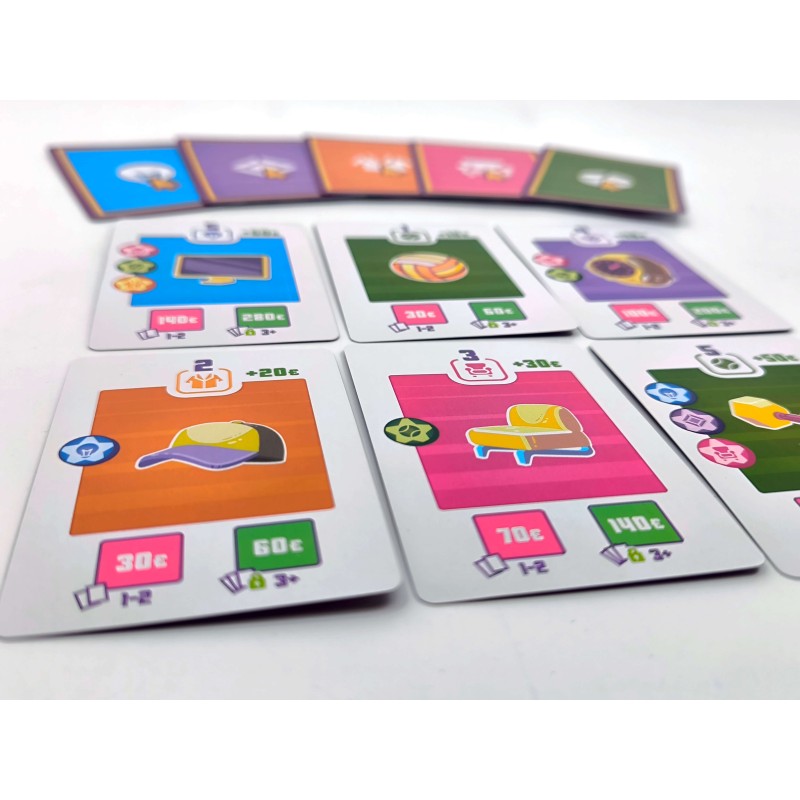 The game features a dynamic turn order system where players with fewer savings go first, creating tension between spending money and maintaining advantageous positioning. Special star tokens provide discounts when fulfilling matching-color orders, adding another layer of strategic planning.