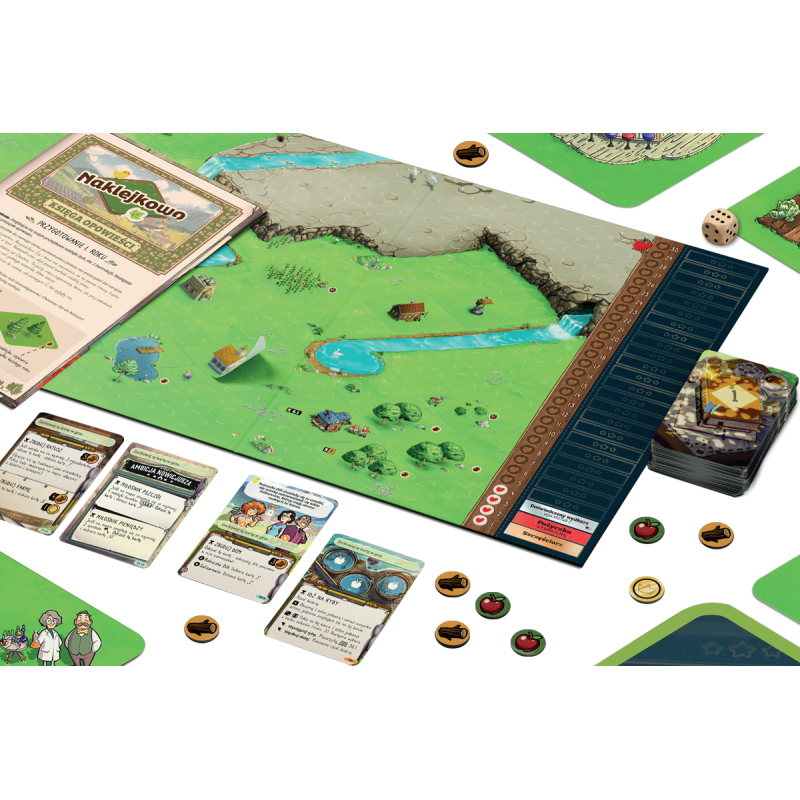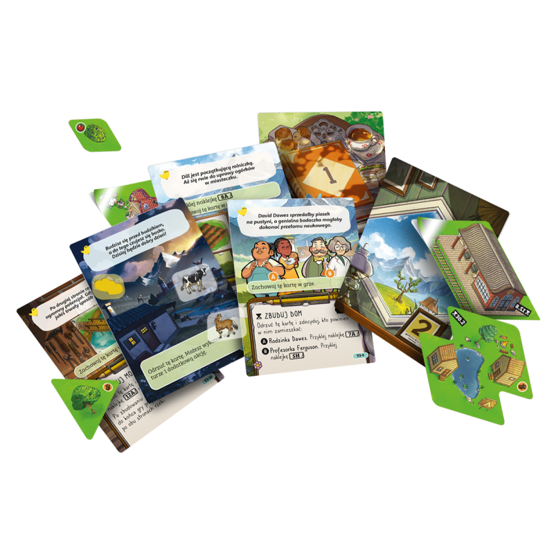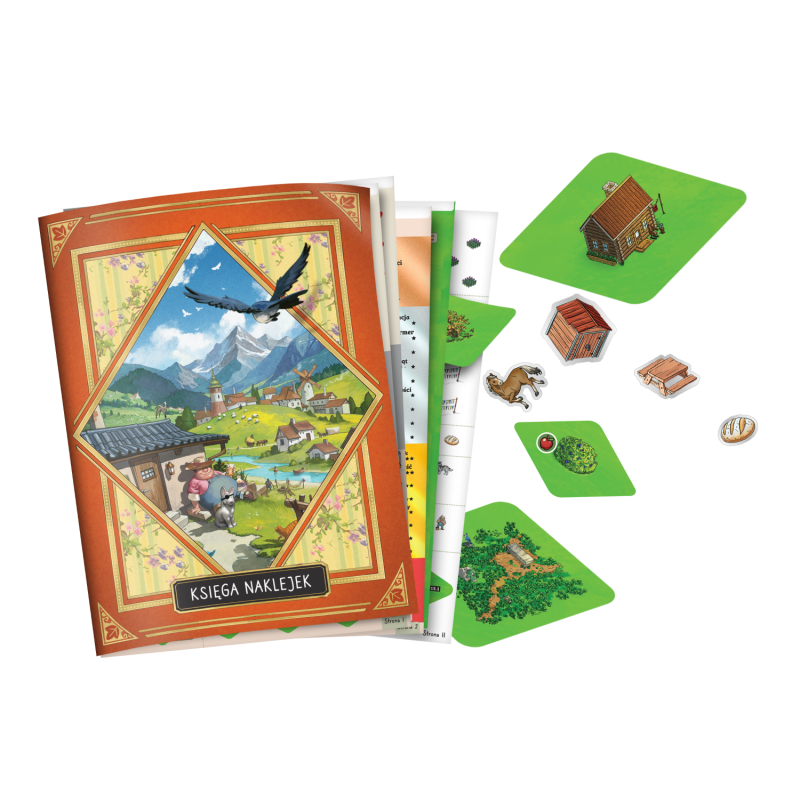 - W pudełku znajdziemy książeczkę z 800 naklejkami, którymi stopniowo będziemy wypełniać mapę, odnotowując nasz postęp i skutki podejmowanych decyzji. Mamy dość dużą dowolność w rozmieszczeniu elementów, więc na przestrzeni gry stworzymy unikalny krajobraz naszej wioski i okolic.