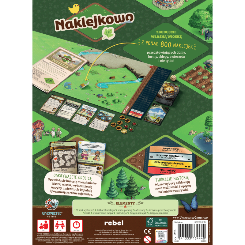Naklejkowo to przytulna gra rodzinna, w której wspólnie rozwijamy wioskę, odkrywając przy okazji historie jej mieszkańców. Opowieść będzie toczyła się na przestrzeni 10 lat, a każda podjęta przez nas decyzja wpłynie na opisywane wydarzenia i zadowolenie poszczególnych osób, prowadząc nas do 1 z 5 unikalnych zakończeń. Postęp będziemy odnotowywali za pomocą naklejek, umieszczając na mapie kolejne budynki i postacie, a także zapisując kamienie milowe naszej opowieści.