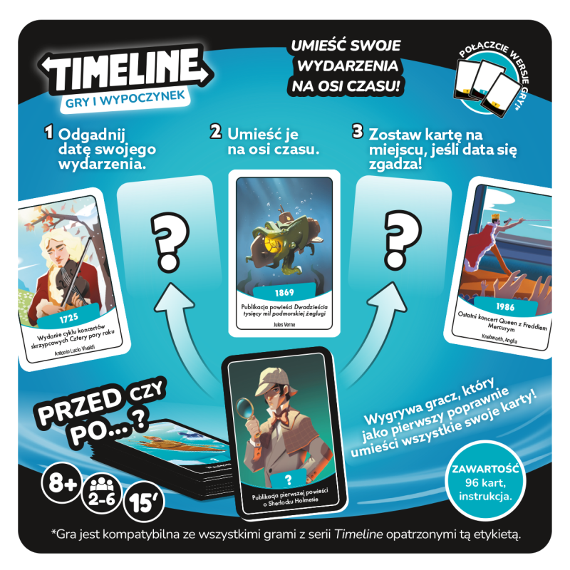 - Zasady gry są niezwykle proste i możemy je poznać w kilka minut, a sama rozgrywka równie dobrze sprawdza się zarówno w duetach, jak i w większych grupach. Dzięki temu Timeline jest tak uniwersalną zabawą!