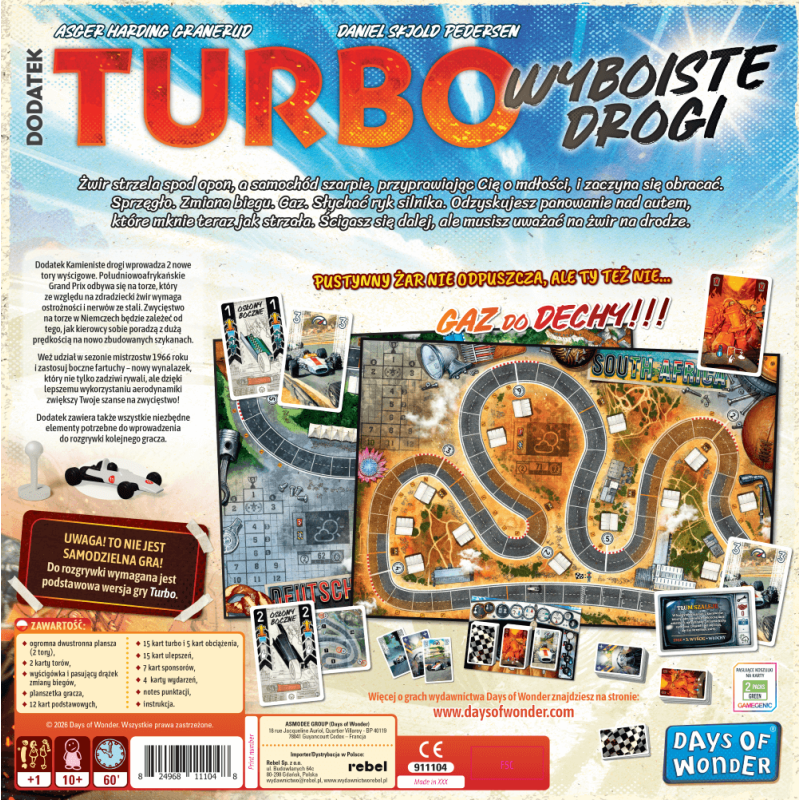 Turbo: Wyboiste drogi to rozszerzenie wprowadzające boczne fartuchy – nowy wynalazek, który nie tylko zadziwi rywali, ale dzięki lepszemu wykorzystaniu aerodynamiki zwiększy Twoje szanse na zwycięstwo. Oprócz tego w pudełku znajdziesz elementy niezbędne do wprowadzenia kolejnego gracza oraz dwa zupełnie nowe tory wyścigowe. Południowoafrykańskie Grand Prix odbywa się na torze, który ze względu na zdradziecki żwir wymaga ostrożności i nerwów ze stali. Z kolei zwycięstwo na torze w Niemczech będzie zależeć od tego, jak kierowcy sobie poradzą z dużą prędkością na nowo zbudowanych szykanach.