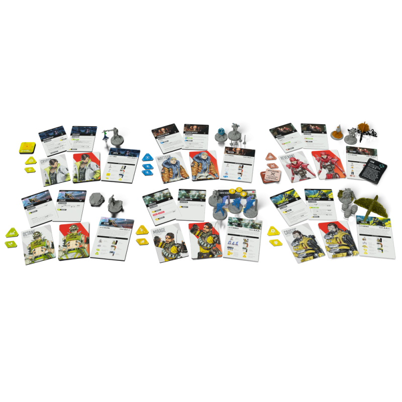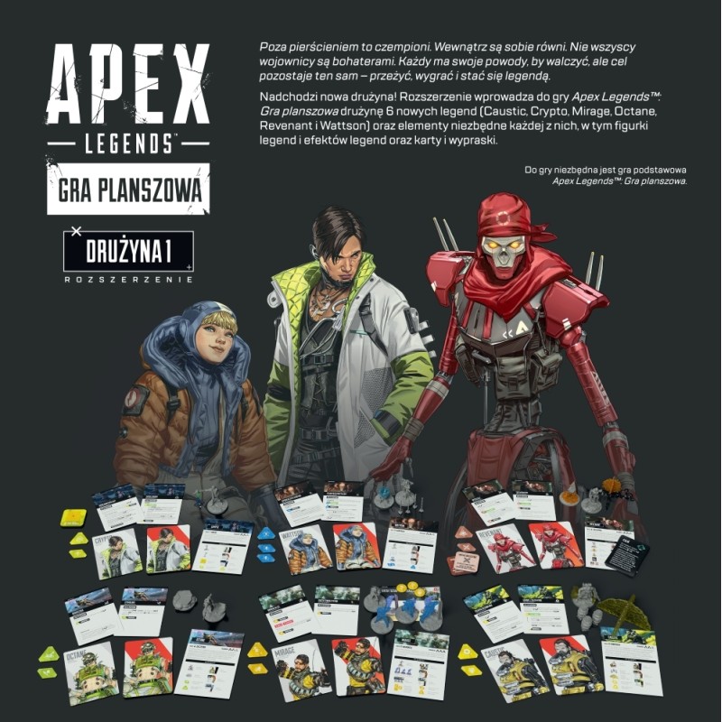 Apex Legends: Gra planszowa - Drużyna 1 wprowadza do gry drużynę 6 nowych legend (Caustic, Crypto, Mirage, Octane, Revenant i Wattson) oraz elementy niezbędne każdej z nich, w tym figurki legend i efektów legend oraz karty i wypraski.