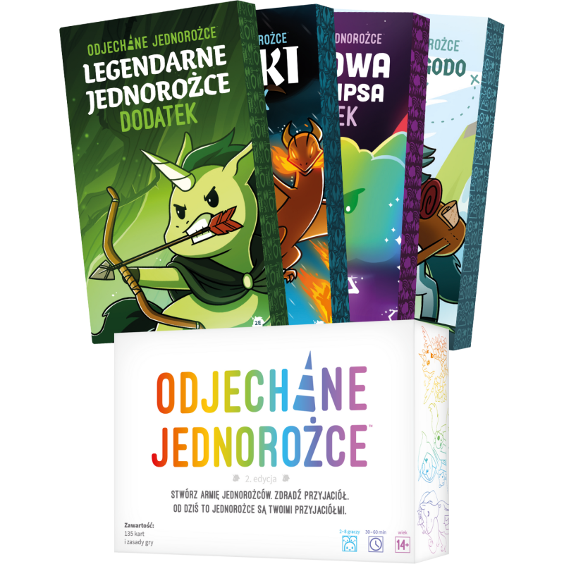 Odjechane Jednorożce: Legendarne jednorożce to rozszerzenie składające się z 54 zupełnie nowych kart, które wprowadzą do Twoich rozgrywek klimat fantasy. Możesz je łączyć zarówno z klasyczną grą podstawową, jak i wersją Bez cenzury.