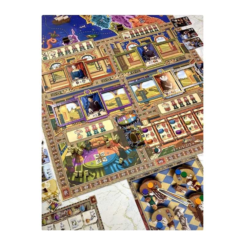 Players take turns resolving their actions, creating Artworks, exhibiting their art across the northern provinces of the Italian peninsula, influencing the taste of the powerful Collectors and competing for publicity of the local elite. The workshop with the most victory points after 4 rounds becomes a winner and is declared the most iconic artist of the Renaissance!