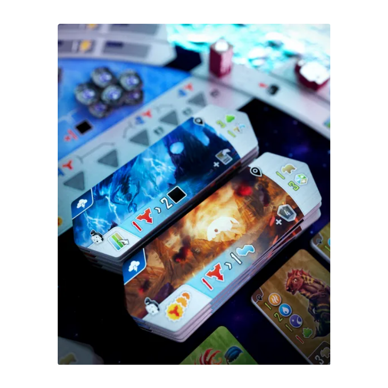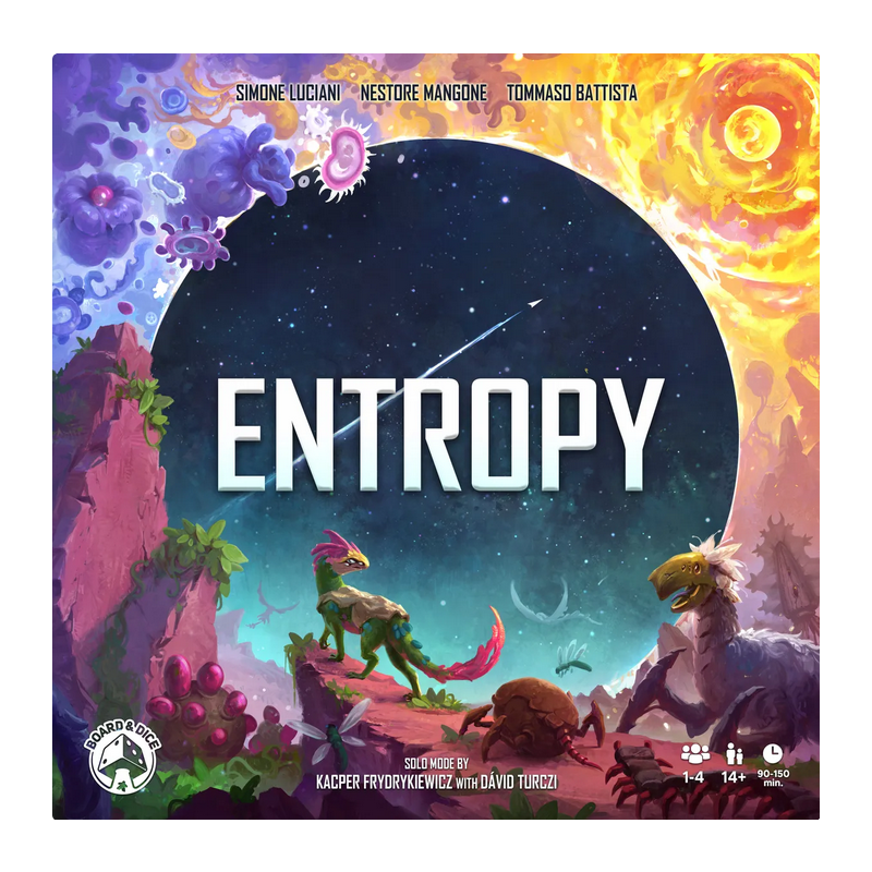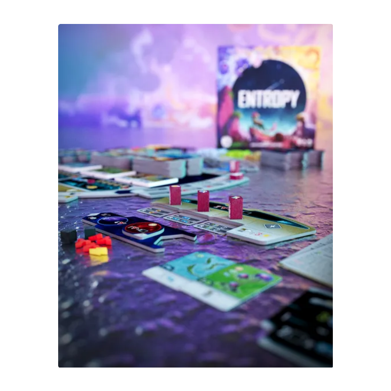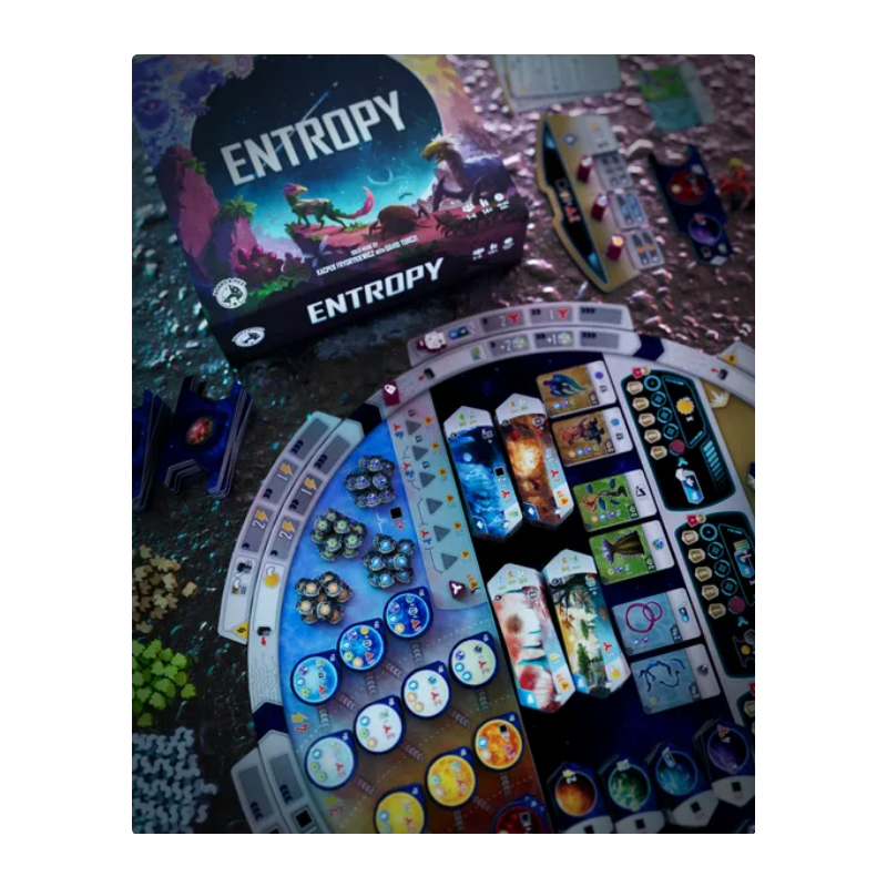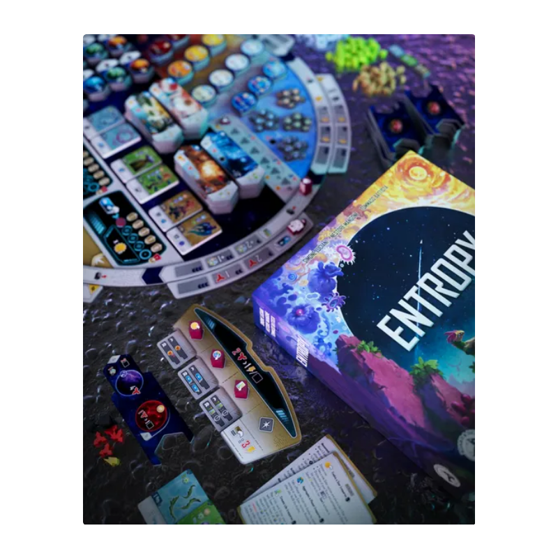 Entropy plays out over a variable number of rounds. Each turn, you must move your Scientist between 1 to 3 spaces clockwise around the Main board. You must end your movement on either an inner Action space on the Main board or an outer space of an Action tile, and resolve it. You will build Solar Systems with Stars, Planets, and Asteroids, then fill them with Life, by playing cards. You may also gain various special abilities by adding Biomes and upgrading your Console.