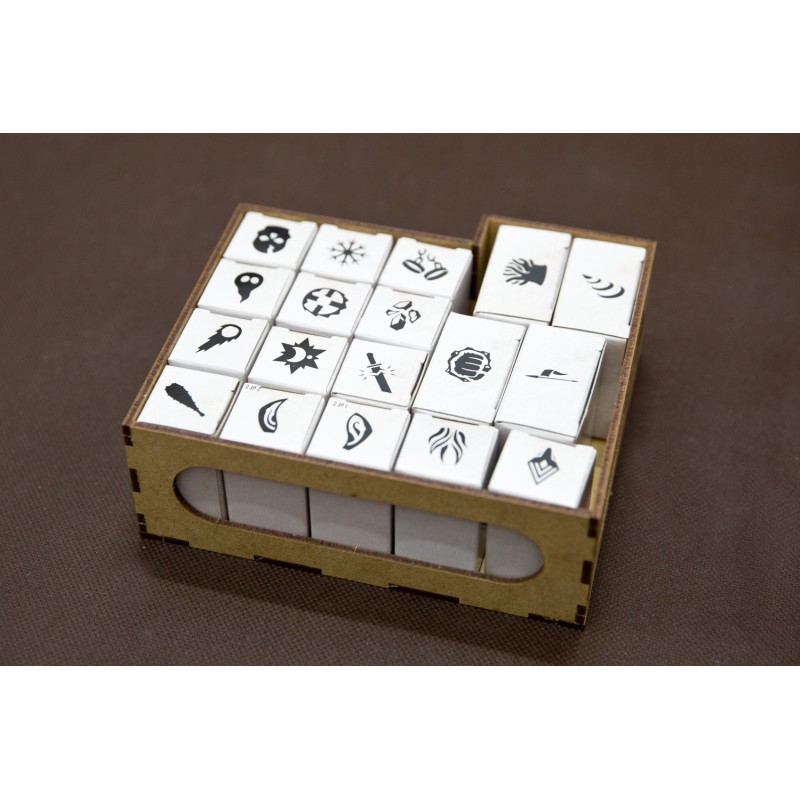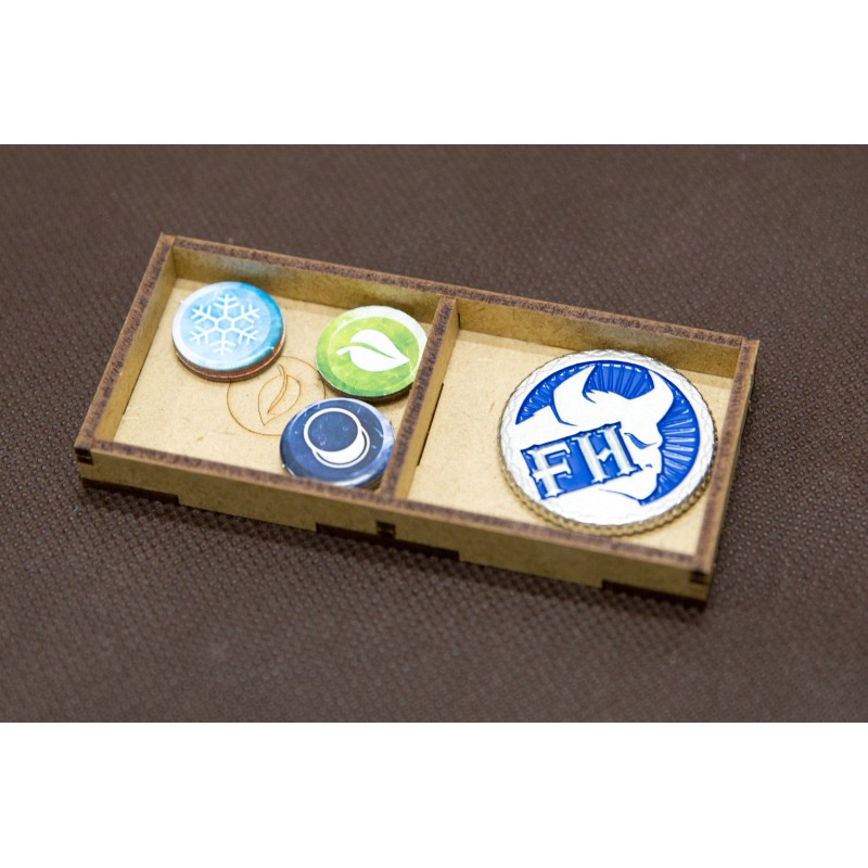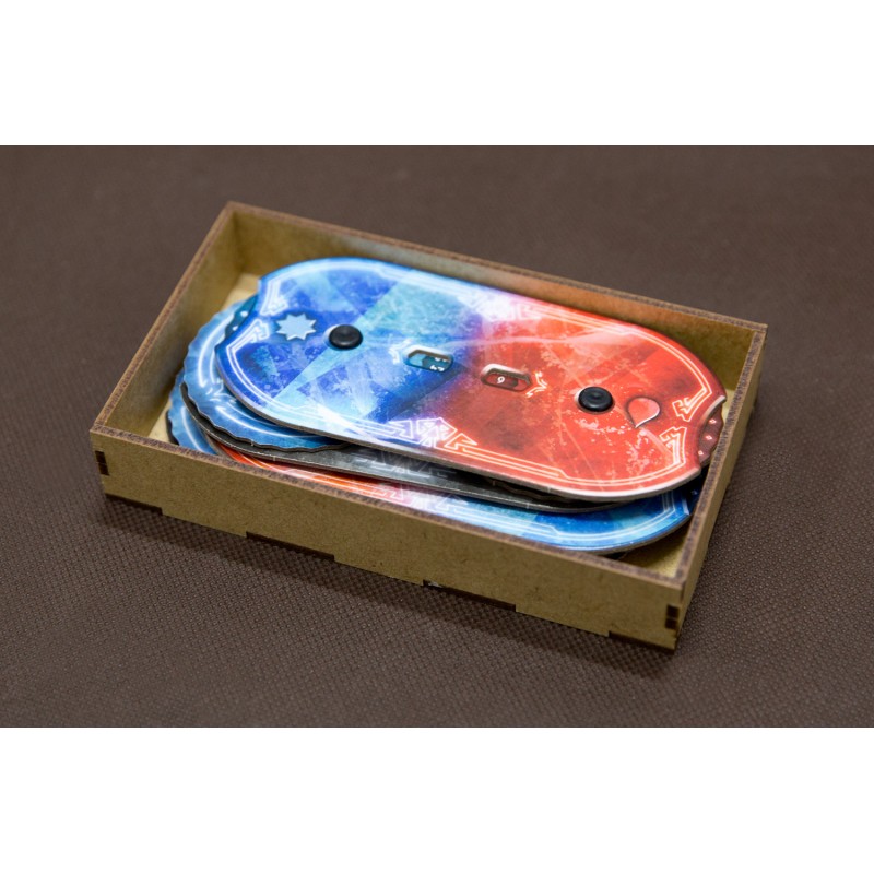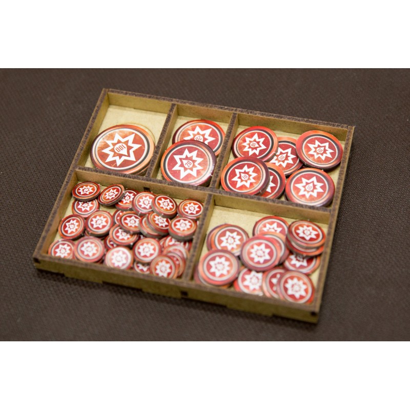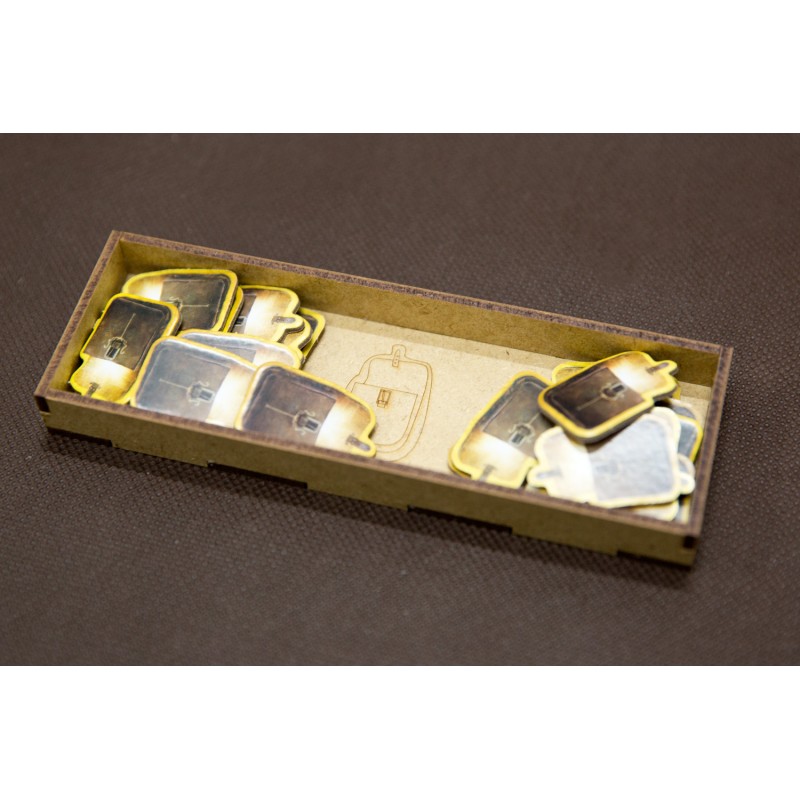 - insert zawiera pojemniki z na żetony obrażeń, łupów oraz stanów stanowiące tacki gotowe do wyłożenia na stół,