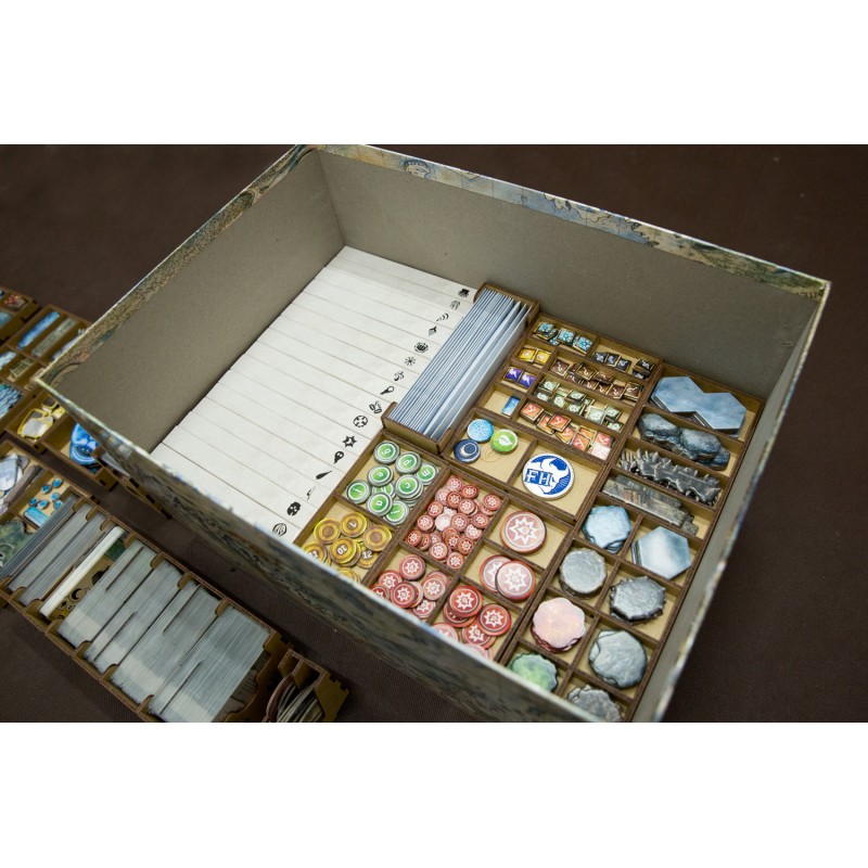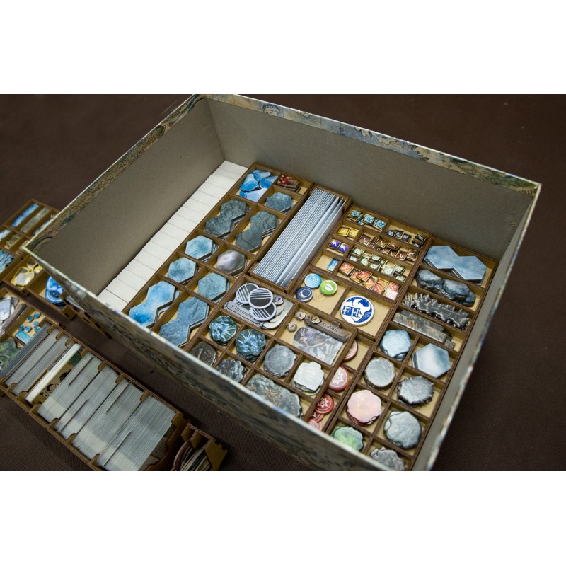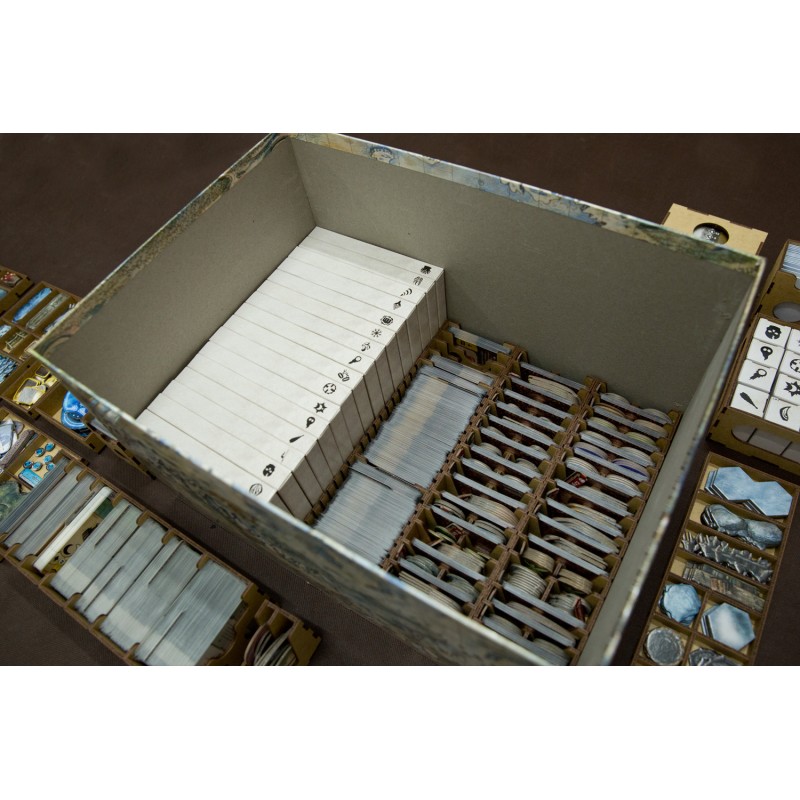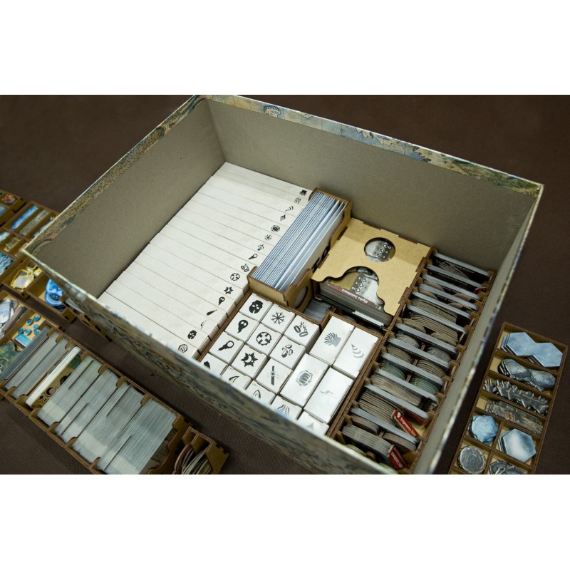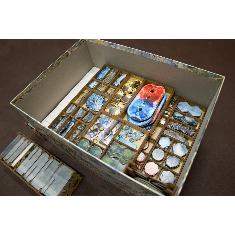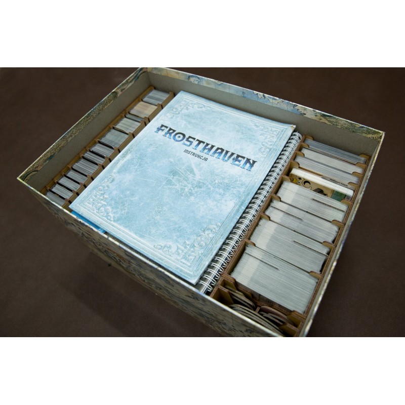 Insert pasujący do gry Frosthaven. Insert mieści karty w koszulkach klasy Premium o grubości do 110 mikronów (z wyjątkiem jednej tali - kart budynków, które są ułożone w kolejności i nie są tasowane). Zalecamy użycie koszulek o grubości do 100 mikronów. Na zdjęciach karty w koszulkach Rebel Premium (100 mikronów).