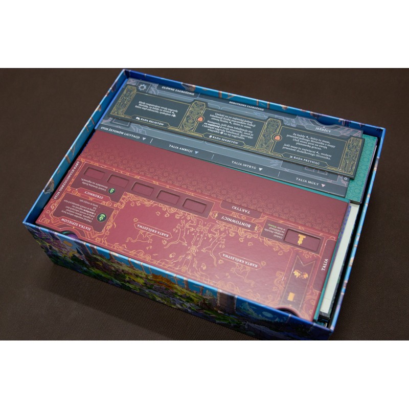 - 1 pojemnik segregujący karty ambicji, intryg oraz zagrożeń i Mgły,