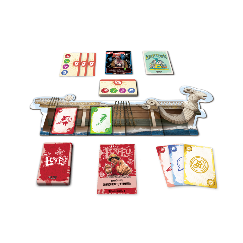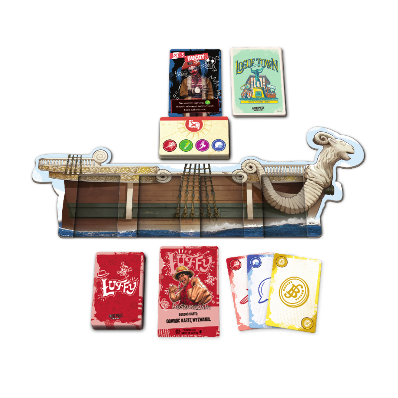 - Karty wyzwań to specjalna talia umieszczona poniżej talii przygód. Aby ukończyć kartę wyzwania, musimy zebrać wskazany na niej zestaw symboli – istotny jest zarówno ich rodzaj, jak i kolejność ułożenia. W tym celu będziemy zagrywać karty z ręki na planszę Going Merry, a także przemieszczać je dzięki rozmaitym efektom.