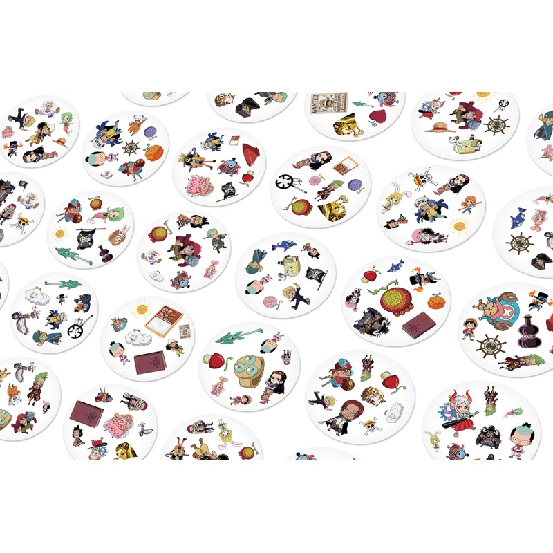 Zabierz Luffy’ego, Zoro, Nami, Usoppa oraz Sanjiego gdzie tylko zechcesz i baw się, szukając par w popularnej grze towarzyskiej! Spójrz na pierwszą kartę, którą trzymasz w ręku oraz na tę, która leży na środku stołu. Znajdź na nich wspólny symbol, nazwij go i szybko pozbądź się swojej karty. Teraz następna! Tylko nie zwątp, dwie karty zawsze łączy dokładnie jeden wspólny obrazek!