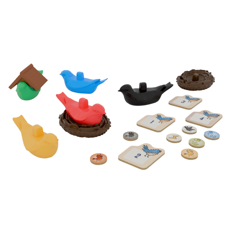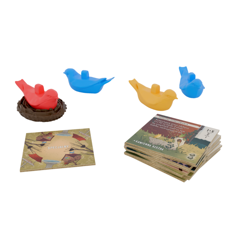 Zawartość: plansza, woreczek, 24 kafelki miejsc, 22 karty celów, 5 kart pomocy, znacznik rundy, 5 żetonów piorunów, 140 ptaków, 1 ptaszarnia, 10 gniazd, 5 domków dla ptaków, 5 znaczników kolejności, 12 przeźroczystych podstawek, 5 znaczników punktacji, 9 kart stworzeń z pionkami