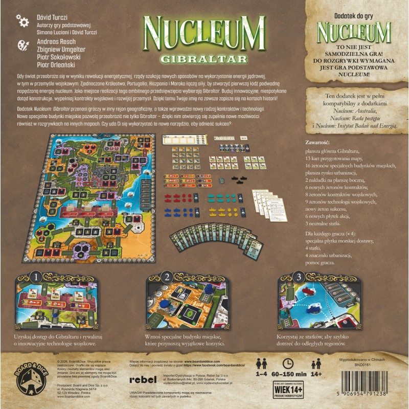 Rozszerzenie Nucleum: Gibraltar przenosi graczy w inny rejon geograficzny, a także wprowadza nowy rodzaj kontraktów i technologii. Buduj innowacyjne, niespotykane dotąd konstrukcje, wypełniaj kontrakty wojskowe i skorzystaj z nadarzającej się okazji, by wytworzyć energię jądrową potrzebną do działania łodzi podwodnej. Innowacje pozwolą przeobrazić nie tylko Gibraltar – dzięki nim otwierają się zupełnie nowe możliwości również w rozgrywkach na innych mapach!