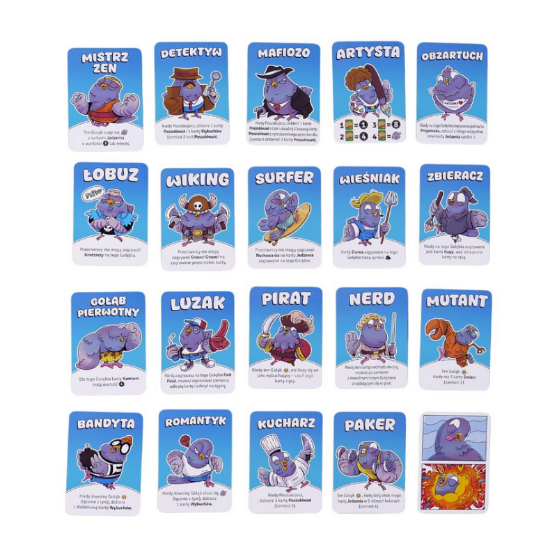 Pełna humoru gra karciana dla osób uwielbiających negatywną interakcję. W trakcie rozgrywki będziecie karmić swoje gołębie i ochraniać je przed nieczystymi zagrywkami przeciwników. Dodatkowo w drodze do zwycięstwa pomogą wam specjalne karty akcji, dzięki którym będziecie mogli pokrzyżować plany pozostałych graczy!