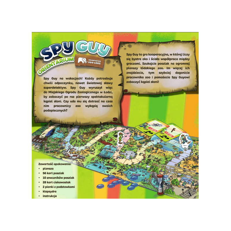 Przemierzajcie ogromną planszę łódzkiego zoo, szukajcie poszlak i starajcie się dogonić pracownika zoo, zanim rozpocznie się kąpiel słoni. Im więcej poszlak znajdziecie, tym szybciej Spy Guy dotrze do celu! Czy zdążycie przed kąpielą słoni? Znajdź jak najwięcej poszlak, aby pomóc Spy Guyowi dotrzeć do celu przed upływem czasu!